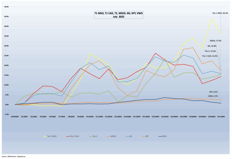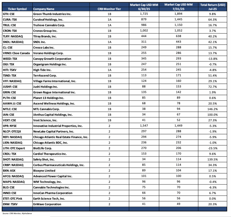 An equally-weighted basket of the largest Tier 1 pure-play cannabis equities rebounded in July 2025 with most of the constituents significantly outperforming the broad equity market. Tier I CRBs outpaced the Tier 2 basket by more than 10%.