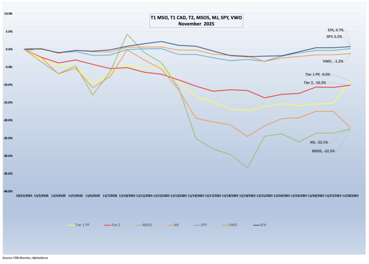 Tier 1 cannabis equities are now in the midst of a 3-month slump (which is part of a longer, multi-year slump), with many of the companies closing out November 2025 with double-digit negative returns. The MSO basket struggled with several CRBs closing out the month in double-digit negative territory. Tier 1A MSO Trulieve Cannabis Corp. (CSE: TRUL) (-25.6%), Tier 1B Cresco Labs Inc. (CSE: CL) (-38.2%), Tier 1B Verano Holdings Corp. (CSE: VRNO) (-32.8%), and Tier 1B TerrAscend Corp. (TSX: TSND) (-33.3%) slumped following November earnings reports. The two largest CRBs by market cap, Green Thumb Industries Inc. (CSE: GTII) (-16.6%) and Curaleaf Holdings, Inc. (CSE: CURA) (-18.0%) were licking their wounds in November as well.