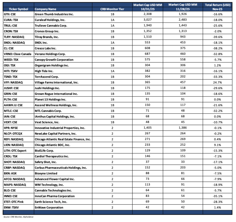The Canadian CRB basket competed with the MSOs for seats at the kid’s table in November. Tier 1B CRB Canopy Growth Corporation (TSX: WEED) (-5.7%) continued on its two-month slide, while Tier 1B craft beverage giant Tilray Brands, Inc. (Nasdaq: TLRY) (-39.6%) won the prize for “worst performing cannabis stock” of November 2025. Tier 1A SNDL, Inc. (Nasdaq: SNDL) (-18.1%), Tier 1B High Tide Inc. (TSXV: HITI) (-16.1%) and Tier 1B Cronos Group Inc. (TSX: CRON) (-2.0%) also disappointed the investors who were still paying attention.
