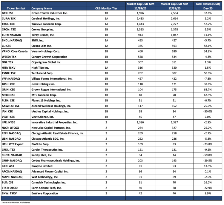 Tier 1 cannabis equities caught rescheduling fever and surged in the second half of December following a several months-long slump. Many of the companies closed out December 2025 with double-digit positive returns. The MSO basket rallied across the board, as investors showed their approval for the latest reform efforts. Tier 1A MSO Trulieve Cannabis Corp. (CSE: TRUL) (+57.7%), Tier 1B Cresco Labs Inc. (CSE: CL) (+58.1%), Tier 1B Verano Holdings Corp. (CSE: VRNO) (+34.9%), and Tier 1B TerrAscend Corp. (TSX: TSND) (+50.0%) soared on the news, which carried implications of tax relief and softer banking conditions. The two largest CRBs by market cap, Green Thumb Industries Inc. (CSE: GTII) (+32.6%) and Curaleaf Holdings, Inc. (CSE: CURA) (+5.2%) were higher in December as well.
