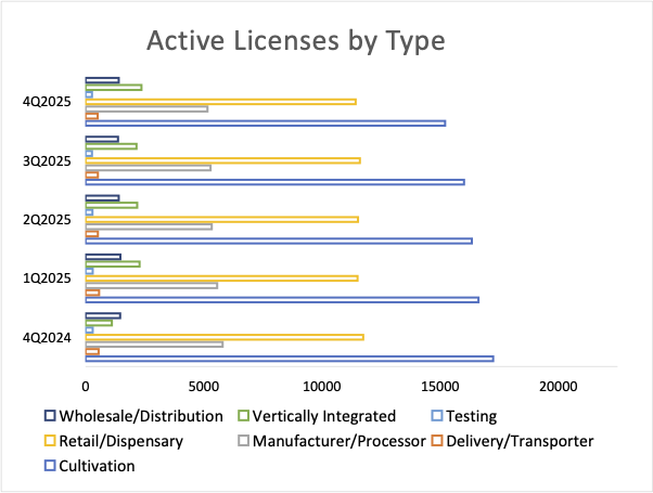 The total number of active cannabis-related business (CRB) licenses continued its multi-year decline in the fourth quarter of 2025, falling 2% to 36,665, a trend that has now persisted in 12 of the last 13 quarters. This overarching narrative of market rationalization is driven by the consolidation of mature markets like California, Colorado, and Oklahoma, which are shedding operators even as newer markets like New York and New Jersey continue their measured expansion.
