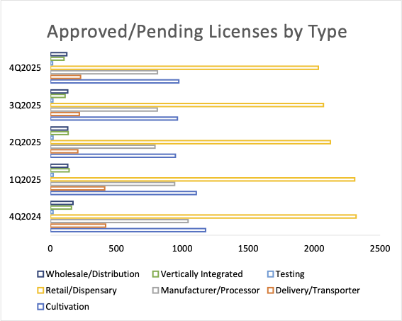 Approved/Pending licenses fell 1% in Q4 to 4,330, marking the sixth consecutive quarterly decline. The 19% annual drop from 2024 levels appears dramatic, but the quarter-over-quarter stability (only 1% less than six months ago) is significant. This stabilization is largely attributed to New York, where a large cohort of applications finally moved through the processing pipeline. This suggests that while the national appetite for new approvals has cooled, the backlog in the nation’s newest major market is slowly being converted into operational businesses.