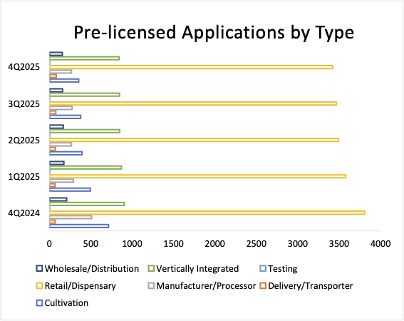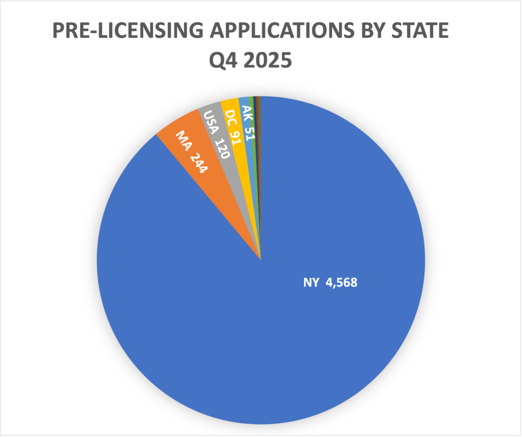 Retailers experienced the sharpest absolute decline, falling by 44 applications in the fourth quarter to 3,420. However, this headline number is misleading. New York applicants comprised a staggering 95% of all retail operator applications in review. This means that outside of New York, interest in opening new retail stores has virtually collapsed. The same dynamic is true for vertically integrated operators, where 825 of the 841 national pre-licensing applications are seeking New York permits.
