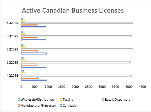 Retail dispensaries remain the largest license type (just over 4,100), showing virtually no growth over two years, while cultivation (911) and manufacturer/processor (587) sectors are similarly static. Canada has become a mature, stable market where the focus has shifted from expansion to operational efficiency and profitability within a fixed competitive landscape.