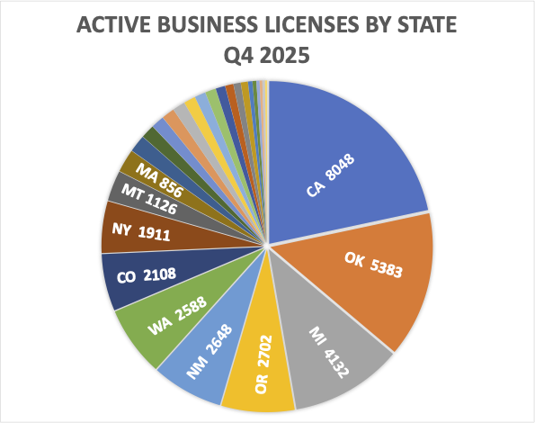 Oklahoma’s Ongoing Purge: The story of contraction is best told in Oklahoma. Now three and a half years into a moratorium and a crackdown on non-compliant operators, the state shed another 823 licensed businesses in Q4 alone. This represents a 15% quarterly drop and a staggering 56% reduction over two years. Despite this, Oklahoma remains the second-largest state cannabis market by total active licenses, a testament to how over-saturated it had become.