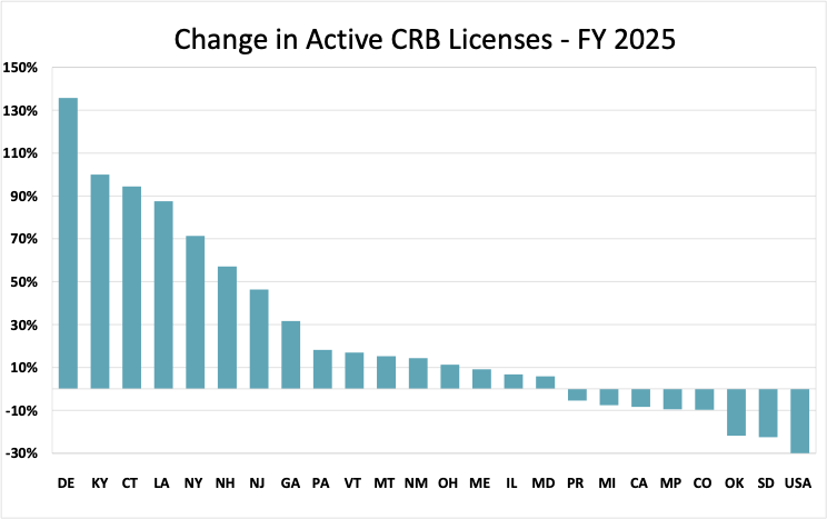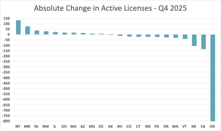 Overall, 19 states gained licensees in Q4 while 14 lost them. This as a welcome reprieve from the broad multi-year retrenchment that preceded it, suggesting that while rationalization continues, it is no longer a universal phenomenon.