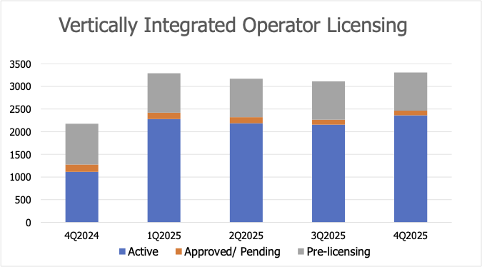 The most dramatic trend in 2025 among operator categories, however, was the explosive growth of vertically integrated operators. The number of active vertical operators nearly tripled over the past two years, reaching a high of 2,362 by the end of 2025. This represents a 10% quarterly and a staggering 112% annual increase. While this suggests a powerful business model, much of this growth, particularly in early 2025, was not organic. In New Mexico, a one-time recharacterization of existing licensees reclassified almost 600 operators holding multiple licenses as single master vertical licensees. This regulatory re-labeling, rather than new market entry, artificially inflated the national numbers. New Mexico now leads the nation with over 900 such operators.