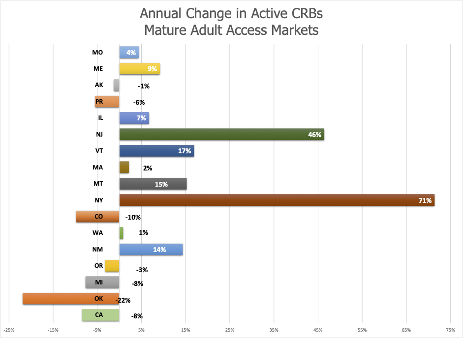 Contraction States: In contrast, Colorado (-10%) and Oklahoma (-22%) saw significant declines as they aggressively pruned their license rolls. California and Michigan, two of the largest markets, experienced 8% contractions, highlighting the intense competitive pressures in those states.