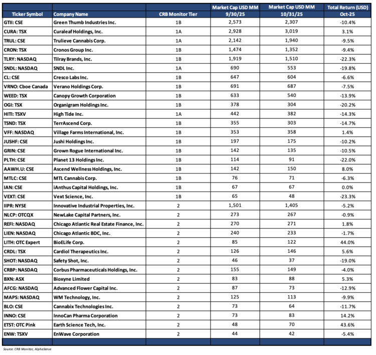 October 2025 CRB performance of Tier 1 cannabis equities continued the 2-month slump following August’s meteoric returns, with many of the companies closing out the month in the red. The MSO basket struggled with several CRBs closing out the month in double-digit negative territory. Tier 1A MSO Trulieve Cannabis Corp. (CSE: TRUL) (-9.5%), Tier 1B Cresco Labs Inc. (CSE: CL) (-6.6%), Tier 1B Verano Holdings Corp. (CSE: VRNO) (-7.5%), and Tier 1B TerrAscend Corp. (TSX: TSND) (-14.7%) slumped ahead of early November earnings reports. The largest CRB by market cap, Green Thumb Industries Inc. (CSE: GTII) (-10.4%) also suffered. One notable exception was Curaleaf Holdings, Inc. (CSE: CURA) (+3.1%) which eked out a positive return in October.