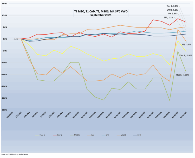 An equally-weighted basket of the largest Tier 1 pure-play cannabis equities (a combination of MSO and CAD companies) gave back some of its August gains in September, largely attributable to the performance of the MSO group. Tier I CRBs underperformed the Tier 2 basket by around 12%.